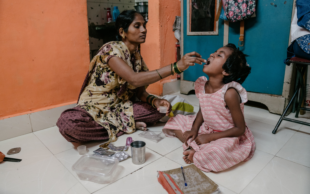 Vaishnavi, a 7-year-old DRTB (Drug Resistant Tuberculosis) patient being given her TB medication by her mother Vishakha.The impact of anti-NGO rhetoric on MSF activities