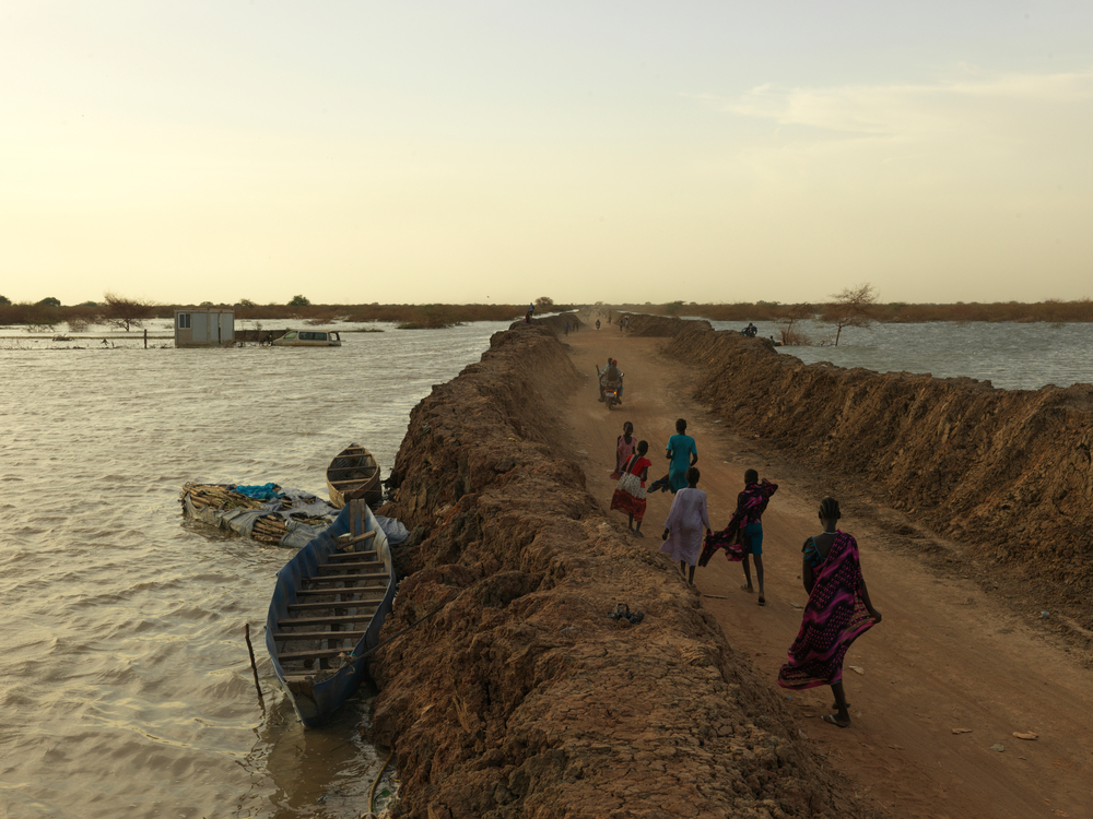 Internally displaced people walk along the road between the dykes into the Bentiu IDP camp, where approximately 120,000 people are currently residing. These dykes are all that are preventing the entire camp from flooding.Rise in malnutrition cases